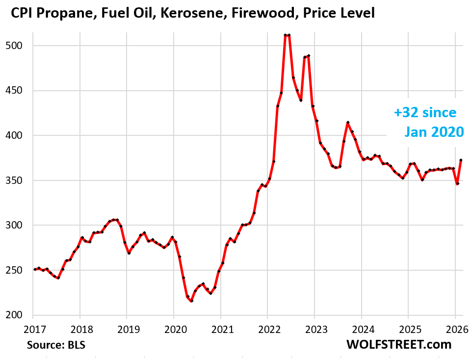Propane, fuel oil, kerosene, and firewood: The CPI for “Other fuels” spiked by 1.1% in February and by 8.6% year-over-year. It too had plunged off the tip of the spike starting in mid-2022. And that plunge seems to have ended in late 2024.