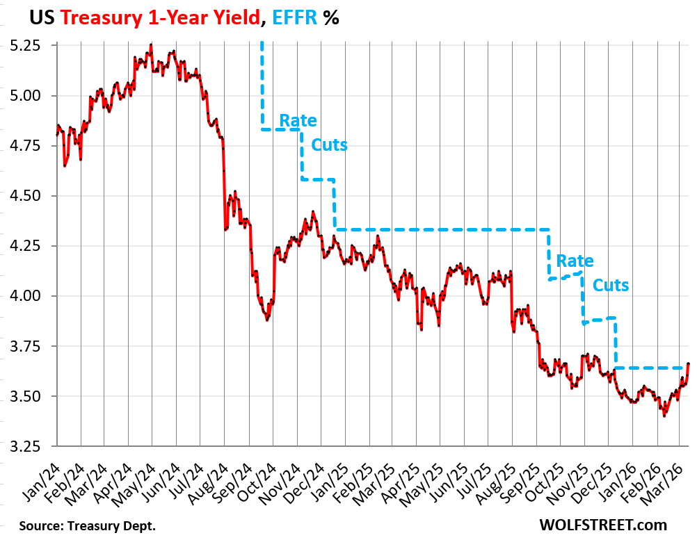 The 1-year Treasury yield squeaked over the Effective Federal Funds Rate (EFFR, blue in the chart) on Friday for the first time since November 2023, which had been nearly a year before the Fed even cut its policy rates. The EFFR is the overnight rate the Fed targets with its policy rates; and with the 1-year yield now at it, the bond market has moved rate cut expectations off the table for this year.