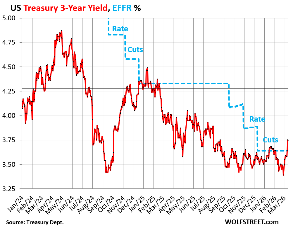 The three-year yield is kind of a bad deal for yield investors, though it can be a good deal for leveraged price speculators, if they can get out quick enough, which is maybe why it got hyped by Wall Street. The 3-year yield lagged the rate hikes in 2022 and 2023 (prices didn’t drop as much), and then it front-ran the rate cuts (prices fell faster sooner). But then at the end of February, it flipped and the yield spiked as these leveraged speculators tried to get out.
