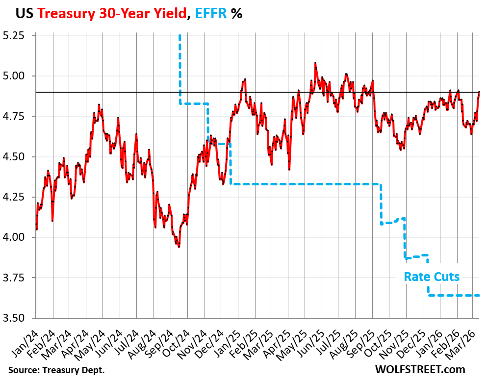 The 30-year Treasury yield rose to 4.90%, the highest since, well, one day in January, and one day in February, and before those two days, the highest since September, three rate cuts ago.