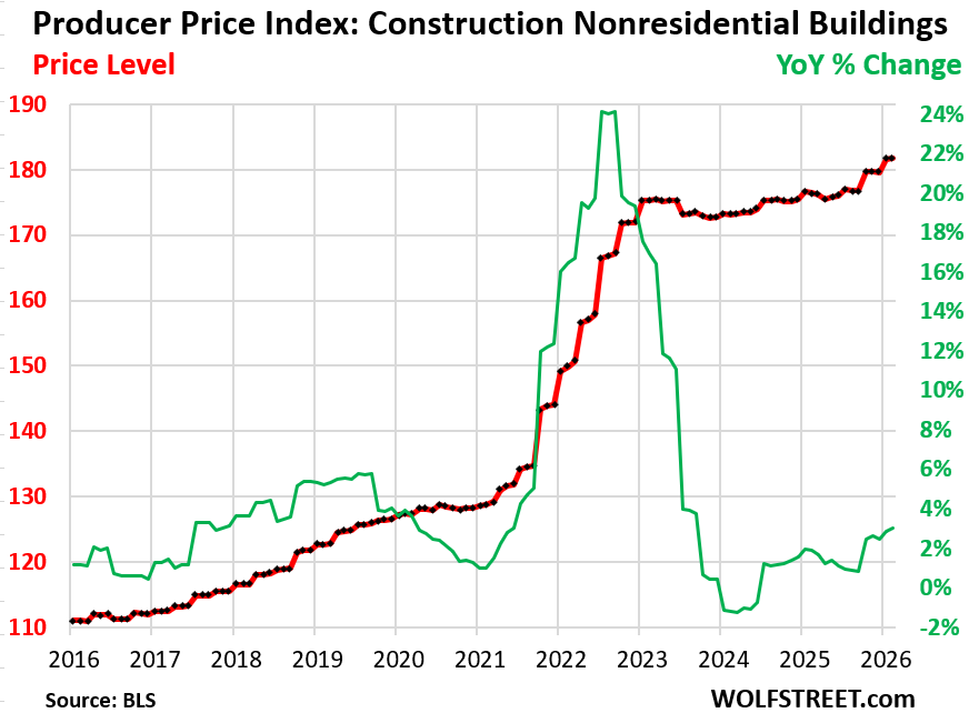 Construction cost inflation: The Producer Price Index for Construction of Nonresidential Buildings, which was part of the hot PPI data released last week, edged up by 0.1% in January from December, and on a year-over-year basis accelerated to +3.1%.
