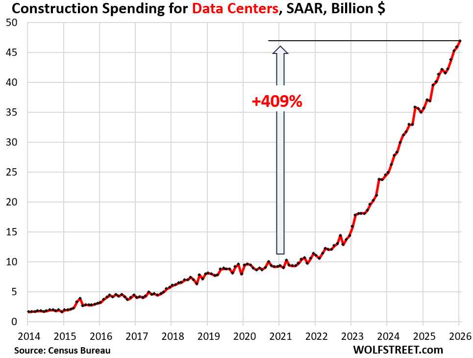 Construction spending on data centers soared by 31% in January from the already spiking levels a year ago to a seasonally adjusted annual rate (SAAR) of $47 billion, up by 409% since the beginning of 2021 – it more than quintupled! – and up by 670% since the beginning of 2018, according to data from the Census Bureau today.