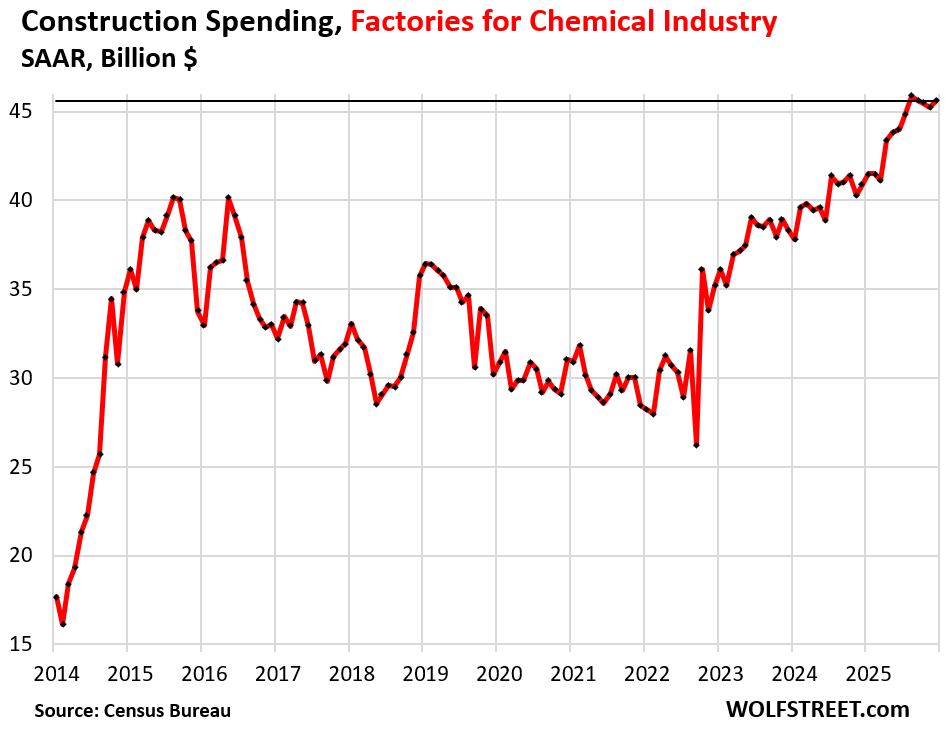 Construction spending on factories for chemical products jumped by 12% year-over-year to a seasonally adjusted annual rate of $46 billion in January, up by 57% from the beginning of 2021.