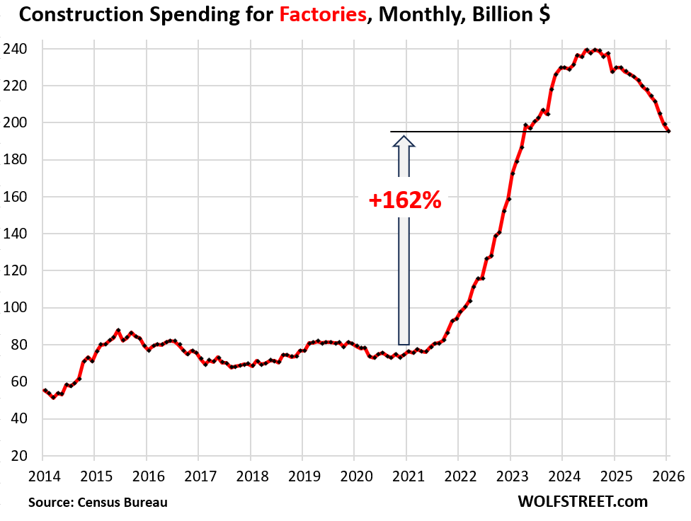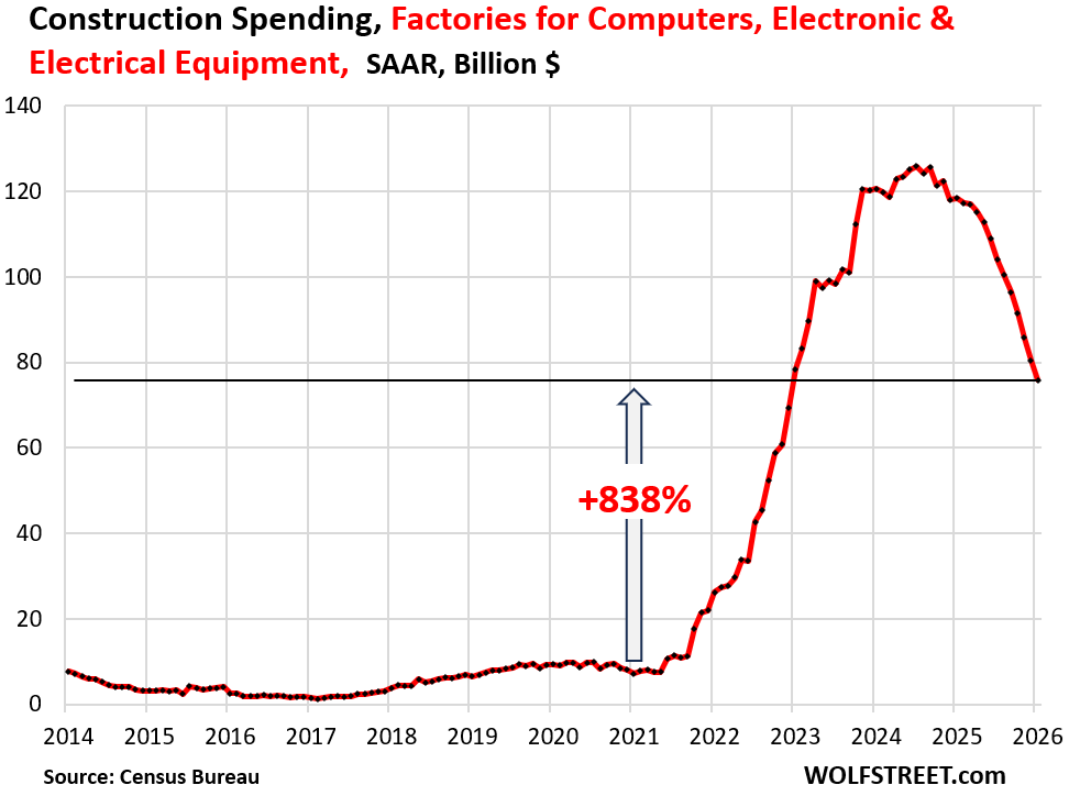 While spending has dropped sharply from the peak in mid-2024, and by 36% year-over-year, to a seasonally adjusted annual rate of $76 billion, that is still up by 838% from the beginning of 2021 and by 1,871% from the beginning of 2018. These are still huge numbers.