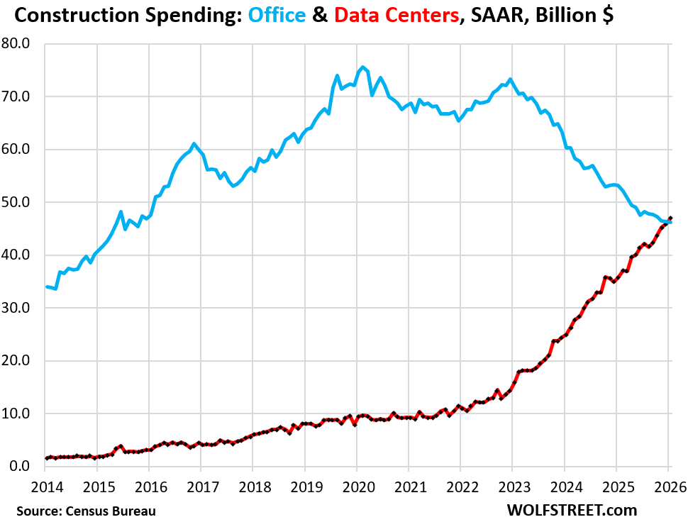 Spending on data center construction (red line) exceeded spending on office construction (blue line) for the first time ever in January. Boom and bust in one chart: