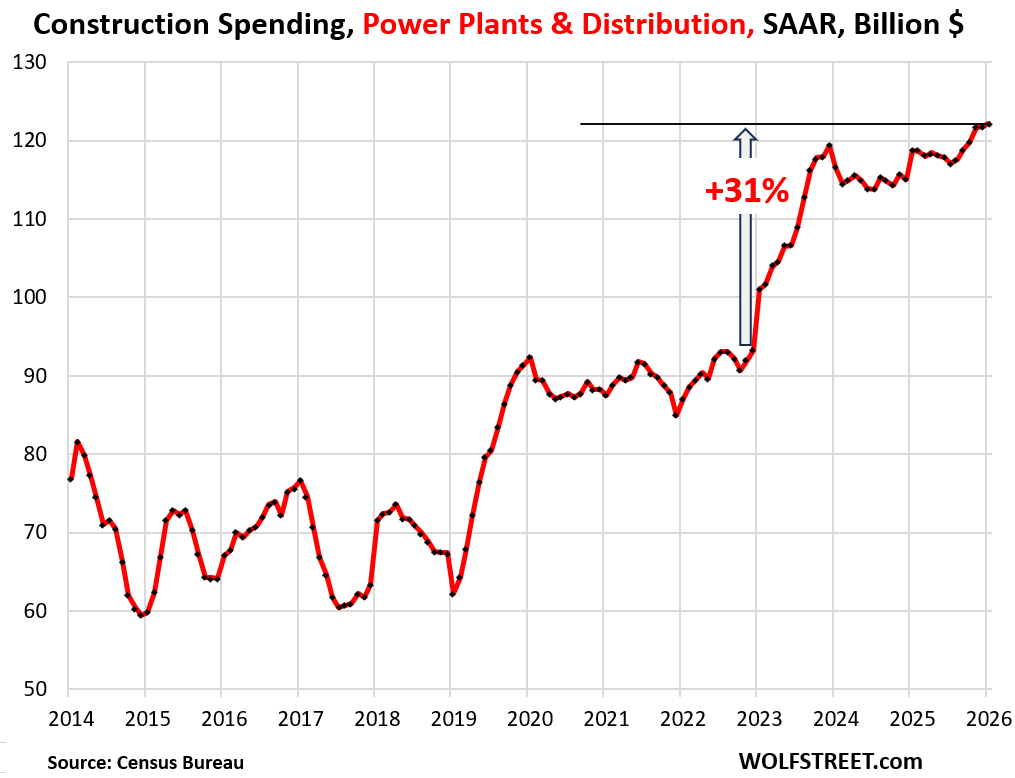 Data centers require prodigious amounts of power, and utilities or the data center providers themselves have to invest in new generating capacity and in transmission infrastructure to get the power to the data centers. But the process of planning and getting permits for a power plant or a transmission line takes a long time, and the construction spending won’t show up here until construction actually starts.