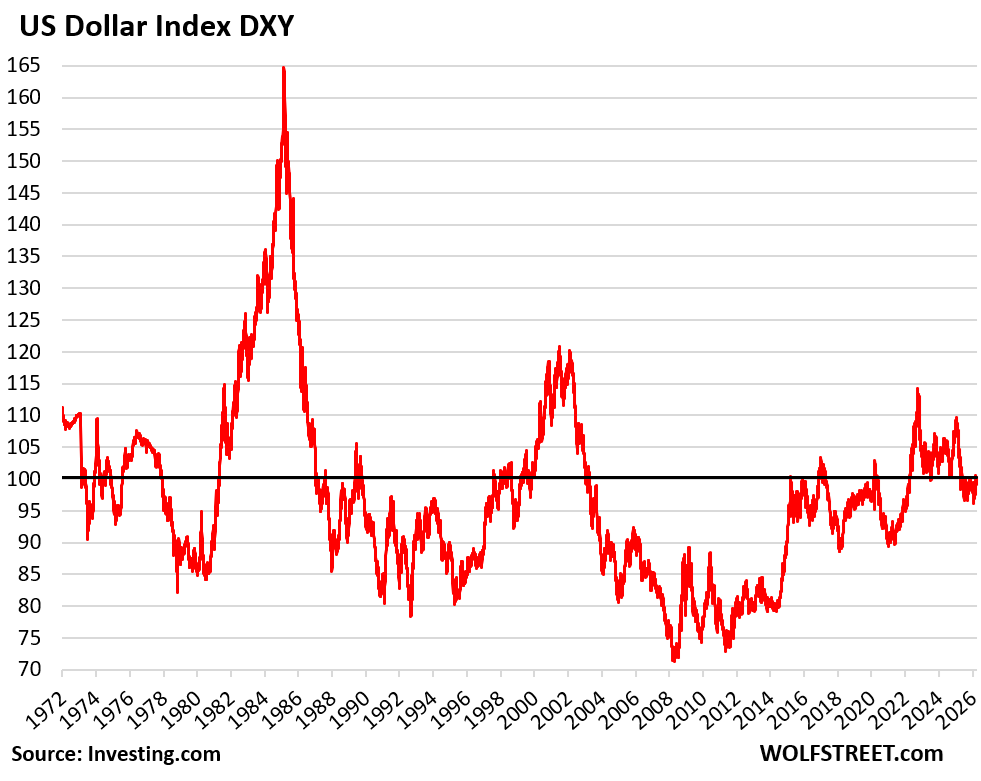 But the US will face some structural issues with its twin deficits when the world is no longer willing to fund them. Those structural issues could be pretty rough, such as high inflation and high interest rates, and the issues they cause. If the Fed tries to keep interest rates low by buying bonds while government-borrowing goes haywire in an inflationary period, inflation will spiral out of control, and the Fed knows that, which is why it won’t do that. Americans have a relentless history of evicting anyone from the White House who they see responsible for this inflation. The way forward for anyone in the White House, Congress, and at the Fed will be to keep inflation in the moderate range and deal with the structural issues. And when foreigners are no longer willing to fund the twin deficits, it will eventually force the government to deal with the twin deficits. And there still won’t be the “demise of the dollar.” (Spoiler alert: Godot never showed up).