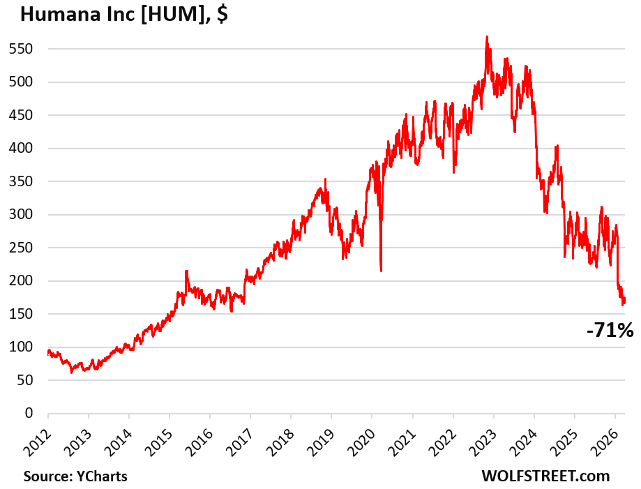 Humana’s shares [HUM], which started cratering in November 2022, have now entered our pantheon of Imploded Stocks, for which the minimum requirement is a plunge of 70% from the more or less recent all-time high. Its shares today fell 1.8% to $166.01, down by 71% from the all-time high on November 3, 2022, and down by 37% from a year ago, and pretty exactly back where they’d first been 11 years ago, in March 2015 (data via YCharts).