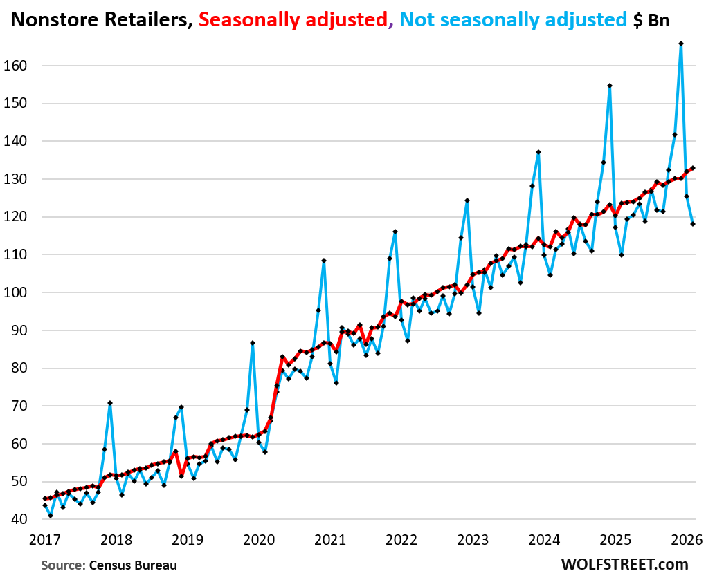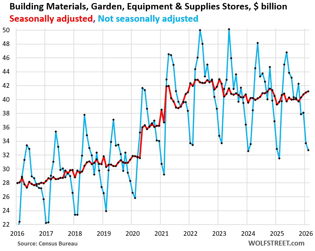 Seasonally adjusted, retail sales in February jumped by 0.6% from January, to a record $738 billion (red line in the chart). Not seasonally adjusted, retail sales plunged by 3.1% in February from January, to $653 billion, the lowest since, well, February last year (blue in the chart).