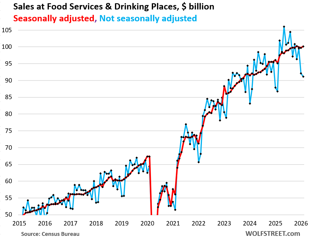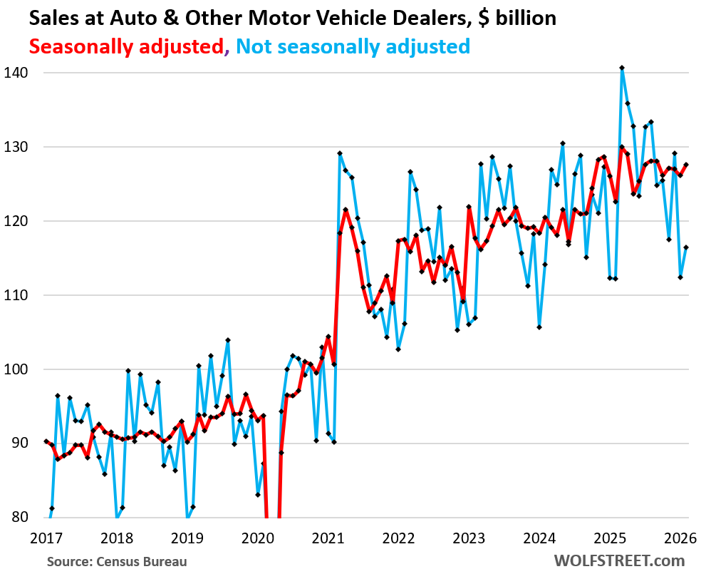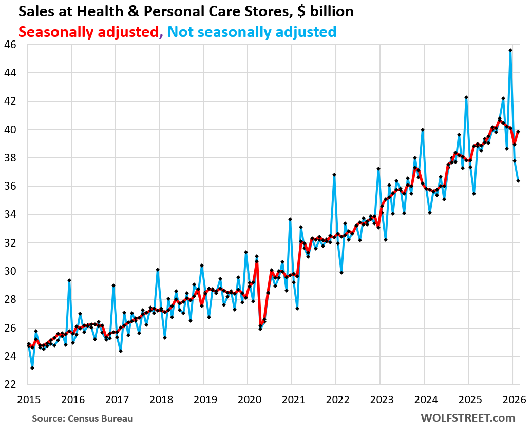 Retail sales soar in December and collapse in January and February, every year to varying extents. Huge seasonal adjustment factors are used to reduce December sales and to increase January and February sales, to roughly level them out. And that was on full display today in retail sales for February, reported by the Census Bureau today.