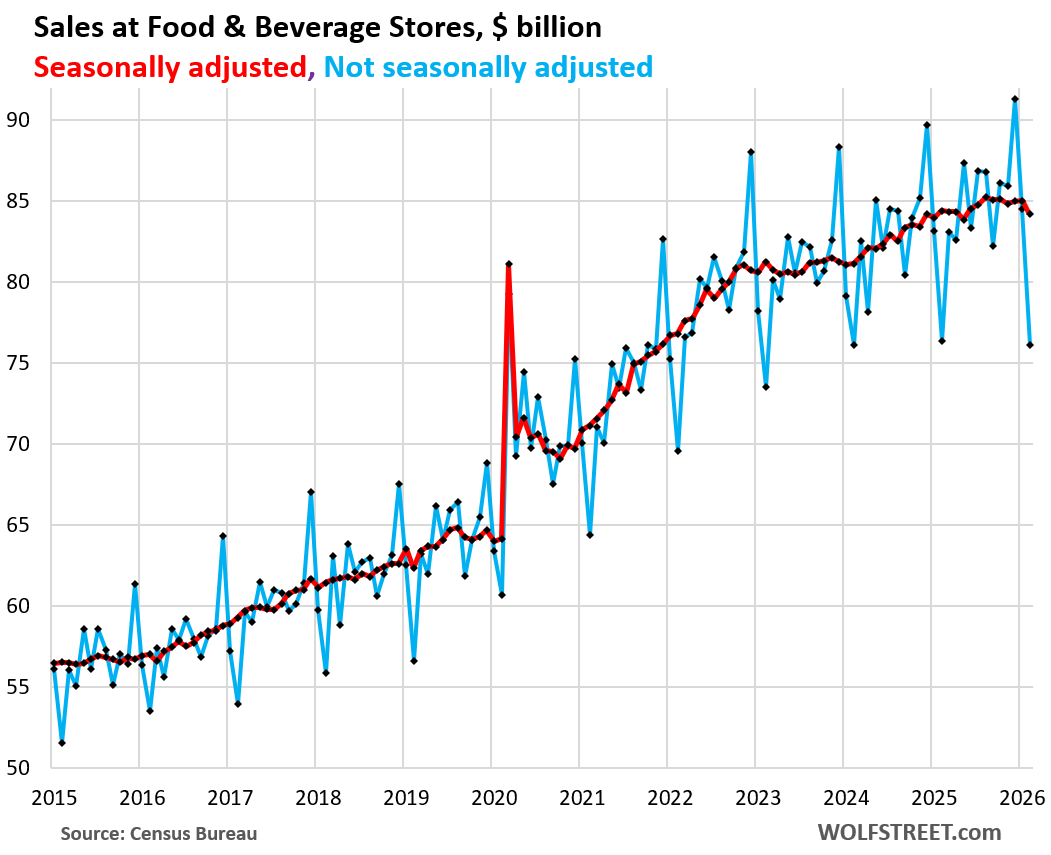 The NSA drop of -9.9% month-to-month in February at food & beverage stores was bigger than normal and pulled the year-over-year comparisons into a decline (-0.3%) from normal-ish positive readings in the prior months. So what happened at these stores in February?