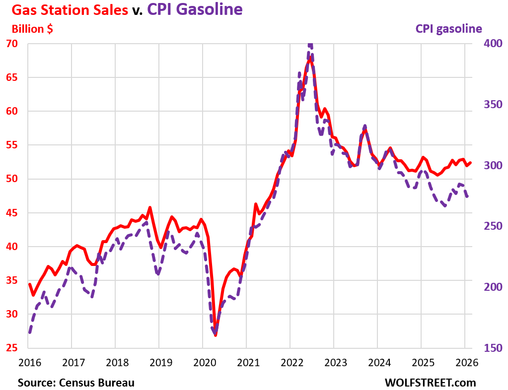 Gas station sales (7.1% of total retail sales) move in near-lockstep with the price of gasoline. Gasoline prices began to spike in March. But in February, they were still benign after dropping in January to the lowest in years.