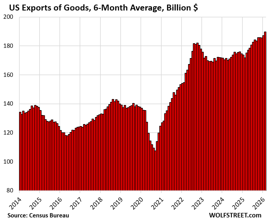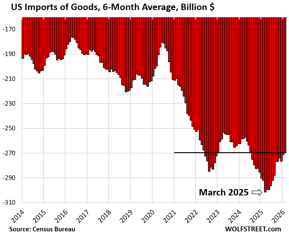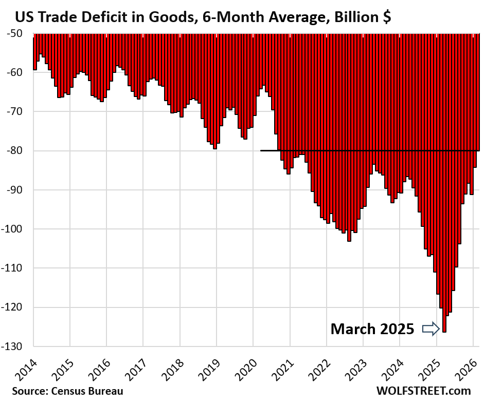 The Census Bureau released the trade figures for February today, and they were another step in the right direction. The trade deficit in goods at $57 billion in February, was down by 52% from the trade deficit in February last year ($120 billion) and down by 58% from the tariff-frontrunning peak in March last year ($136 billion) just before the vast majority of tariffs kicked in. But monthly trade figures are very volatile. The 6-month average irons out those monthly ups and downs and shows the trend.