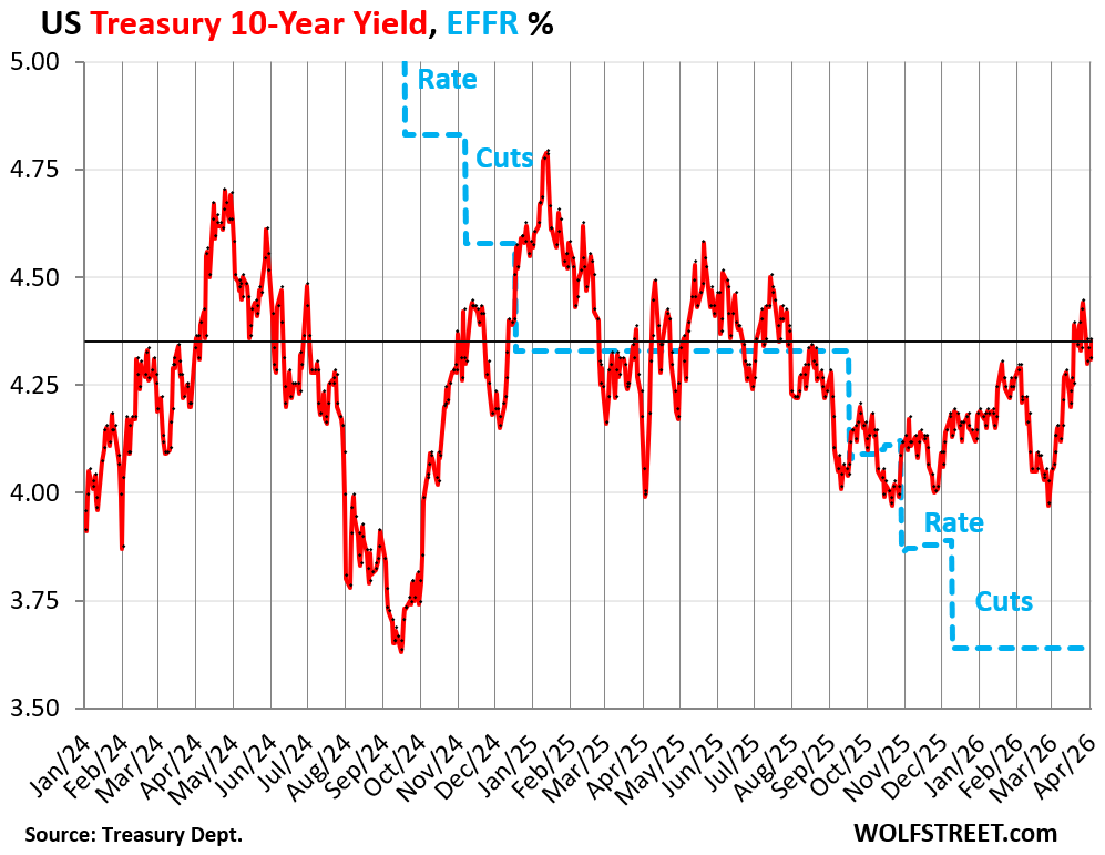 At 4.35% on Friday, the 10-year yield is where it had been in July 2025. And there were three rate cuts in between, as depicted by the Effective Federal Funds Rate (EFFR, blue line), which the Fed targets with its policy rates, and which the 10-year yield has been blowing off.