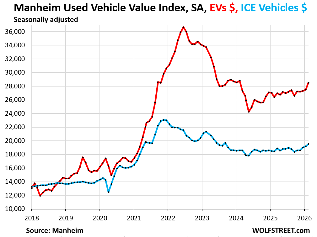 EV prices jumped by 3.7% in March from February, seasonally adjusted, and by 8.0% year-over-year, to $28,471.