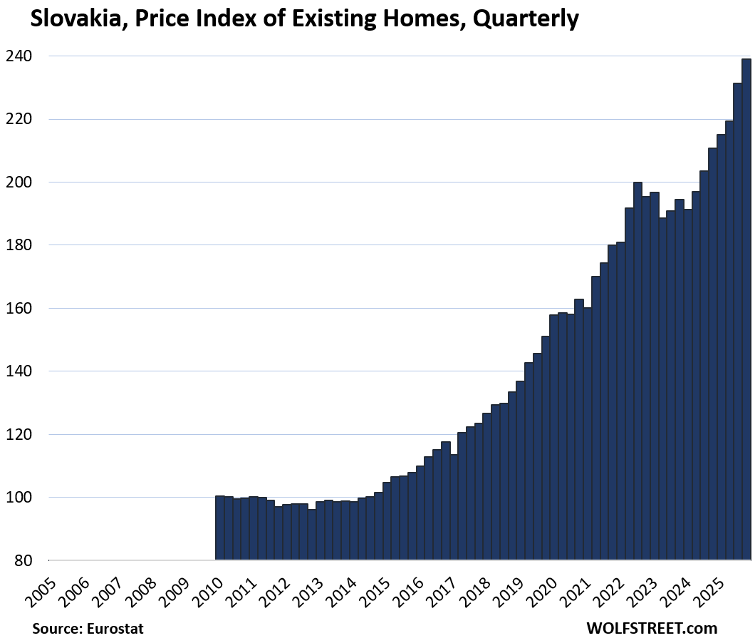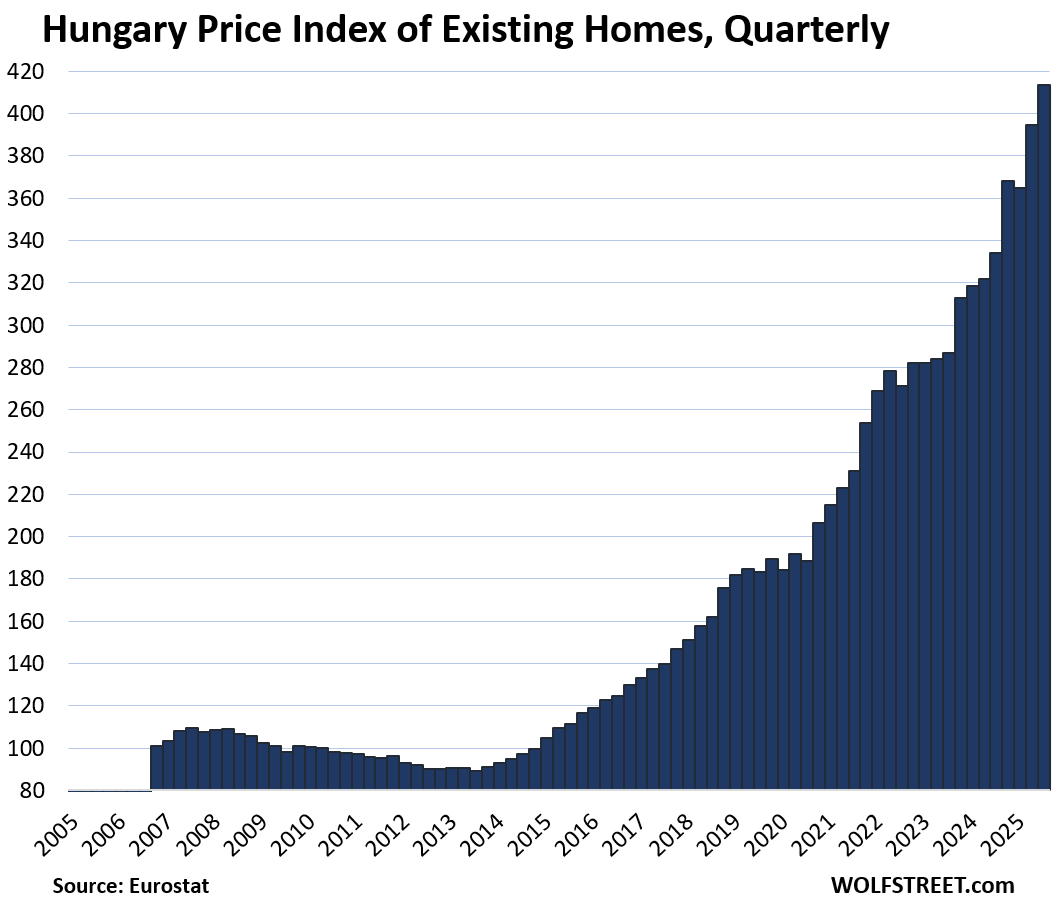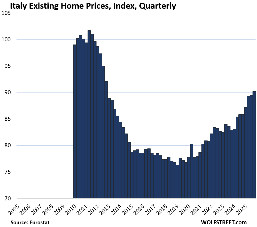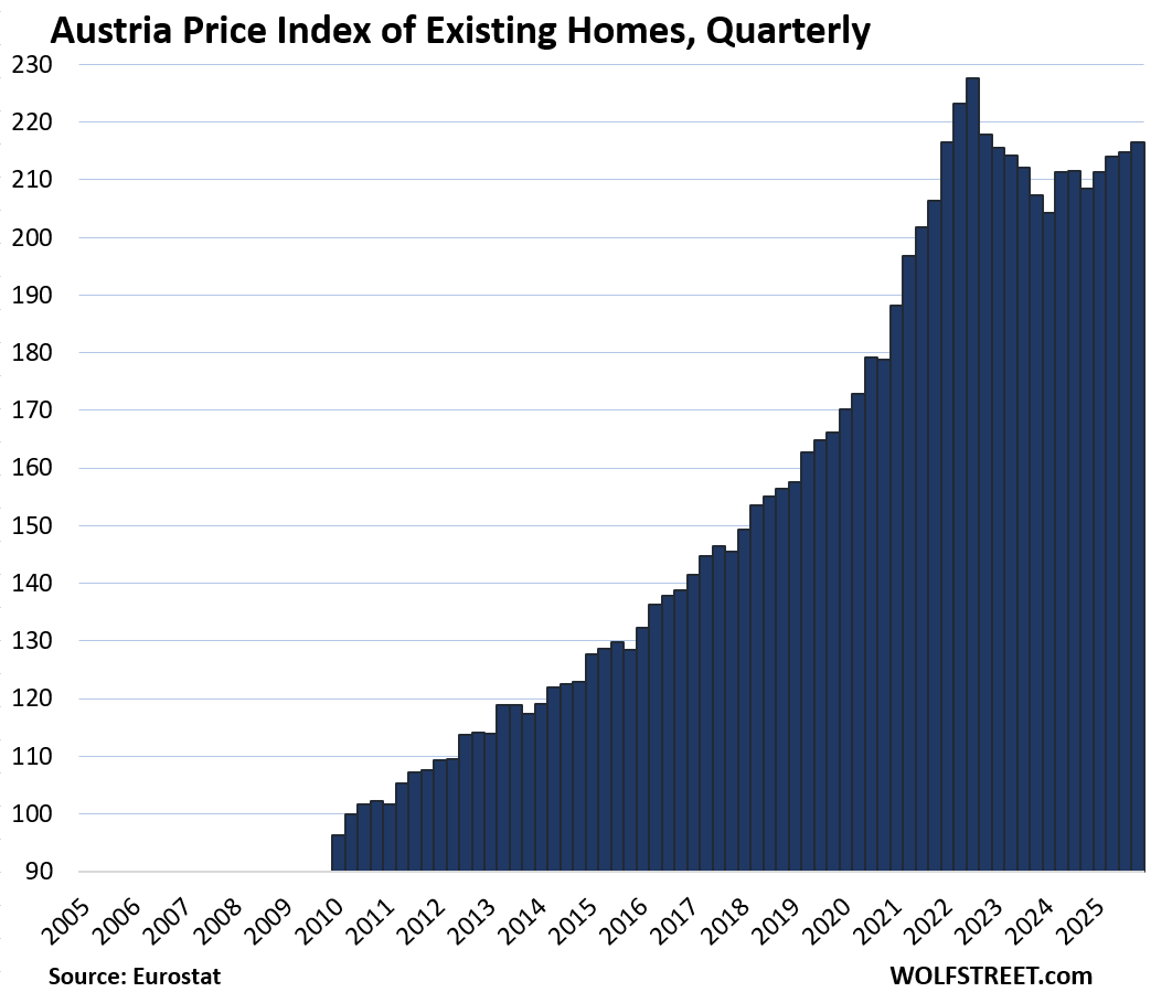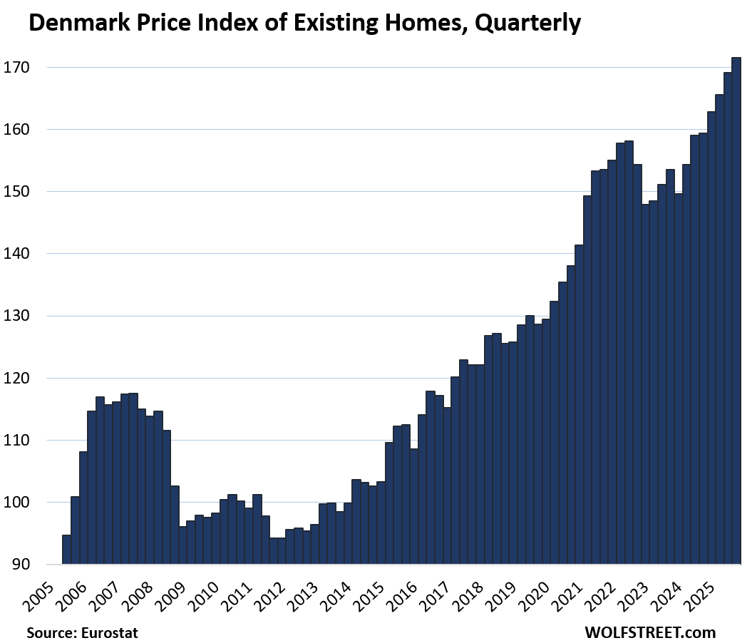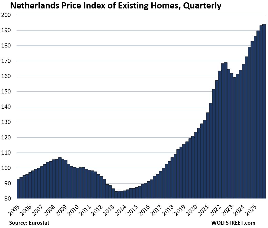 Here is our quarterly wild ride across these 19 housing markets in Europe, based on the new data from Eurostat through Q4 2025 for existing homes.