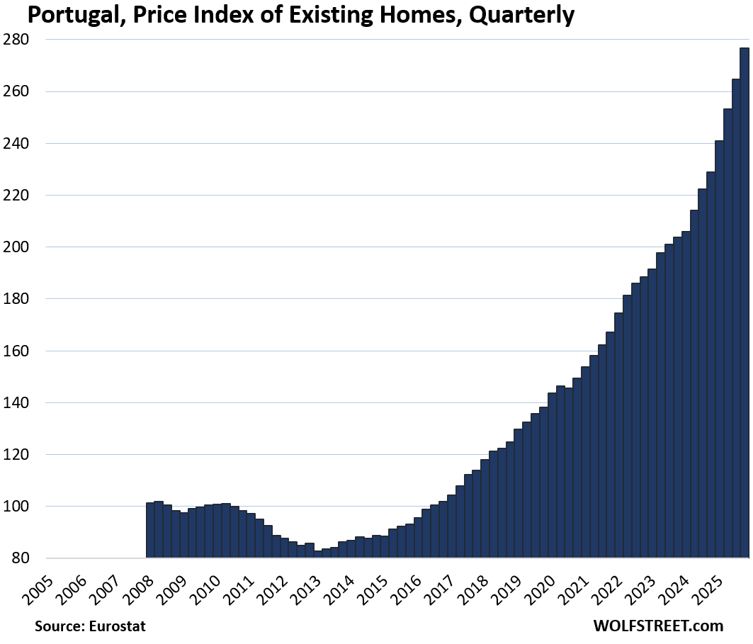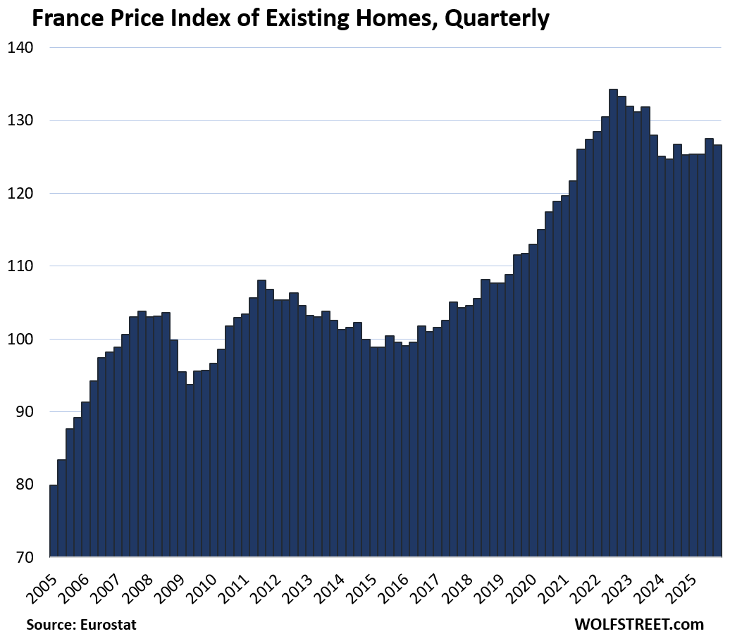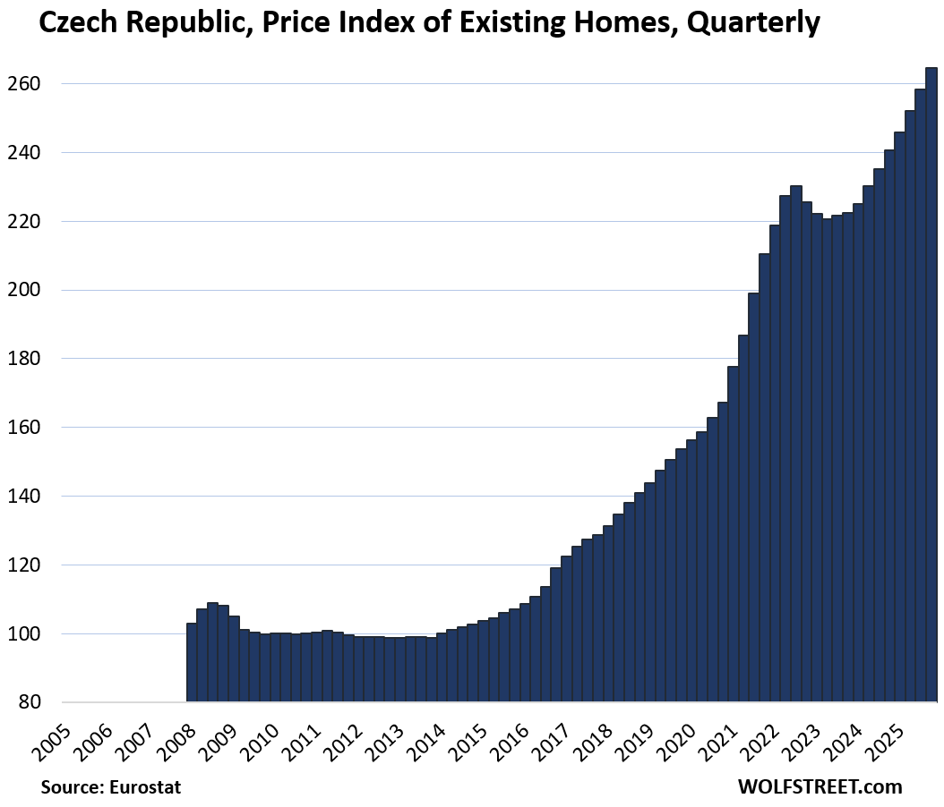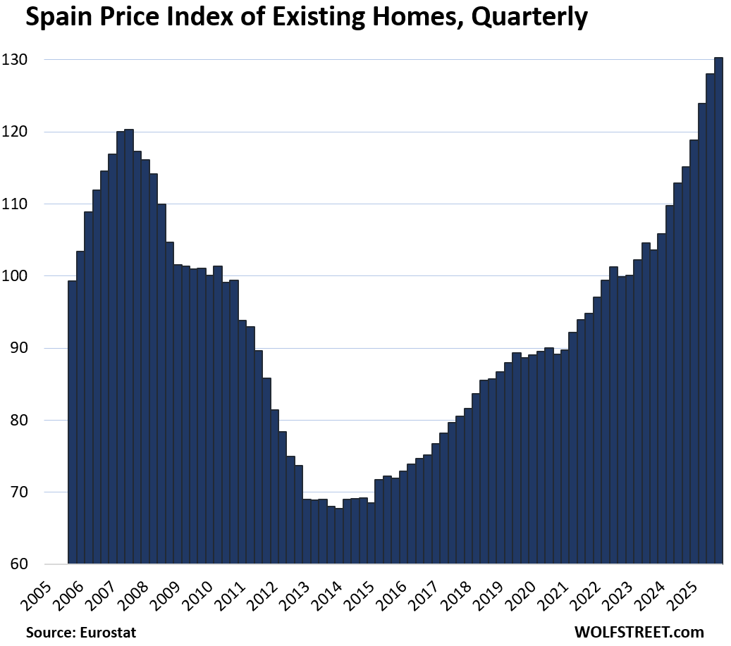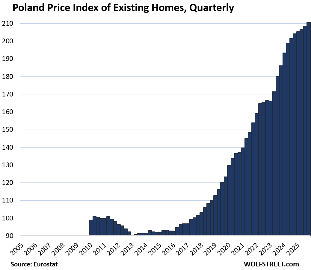 Here is our quarterly wild ride across these 19 housing markets in Europe, based on the new data from Eurostat through Q4 2025 for existing homes.