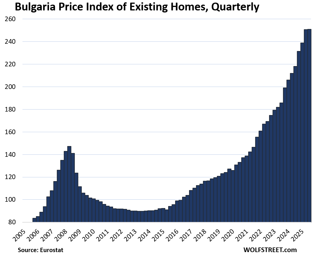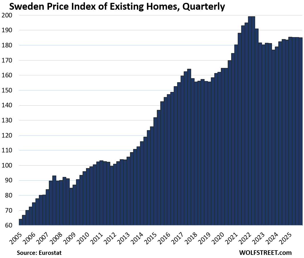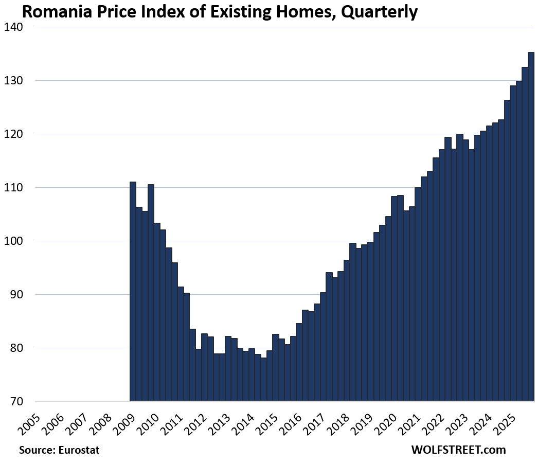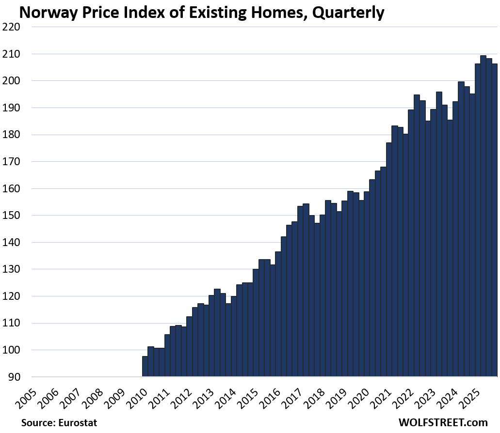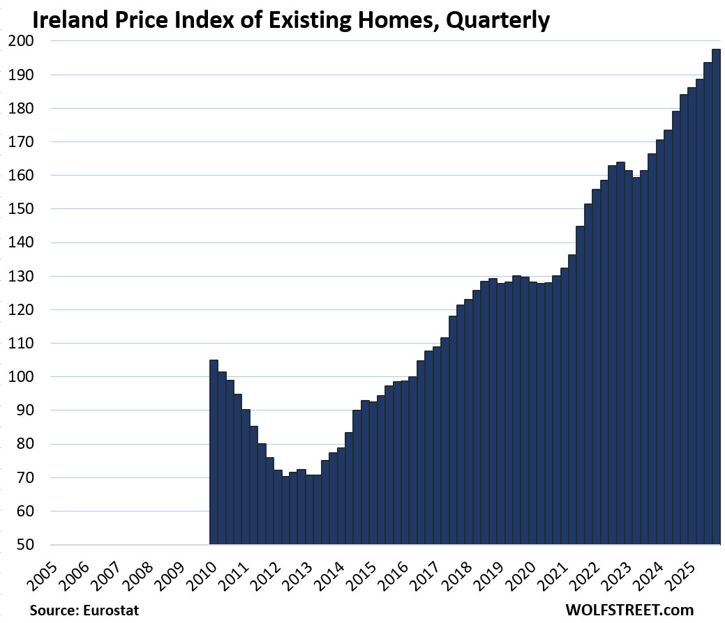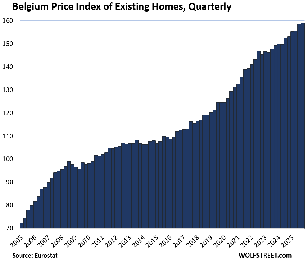 Here is our quarterly wild ride across these 19 housing markets in Europe, based on the new data from Eurostat through Q4 2025 for existing homes.