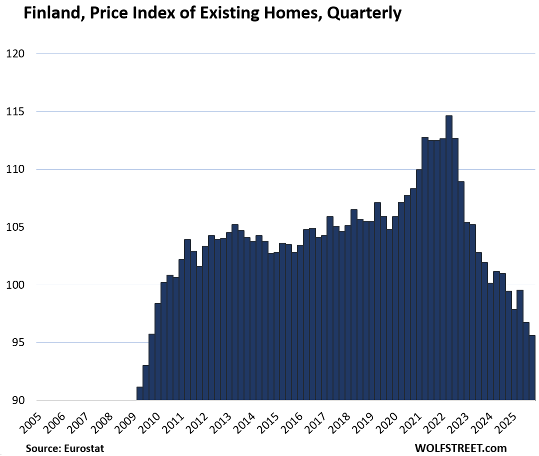 In Italy, prices of existing homes are still below where they’d been in 2011, the prior housing bubble that had imploded, despite substantial increases in recent years. And in Finland, prices have fallen by 16.6% from the peak in 2022 back to 2010 levels.