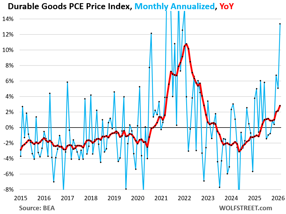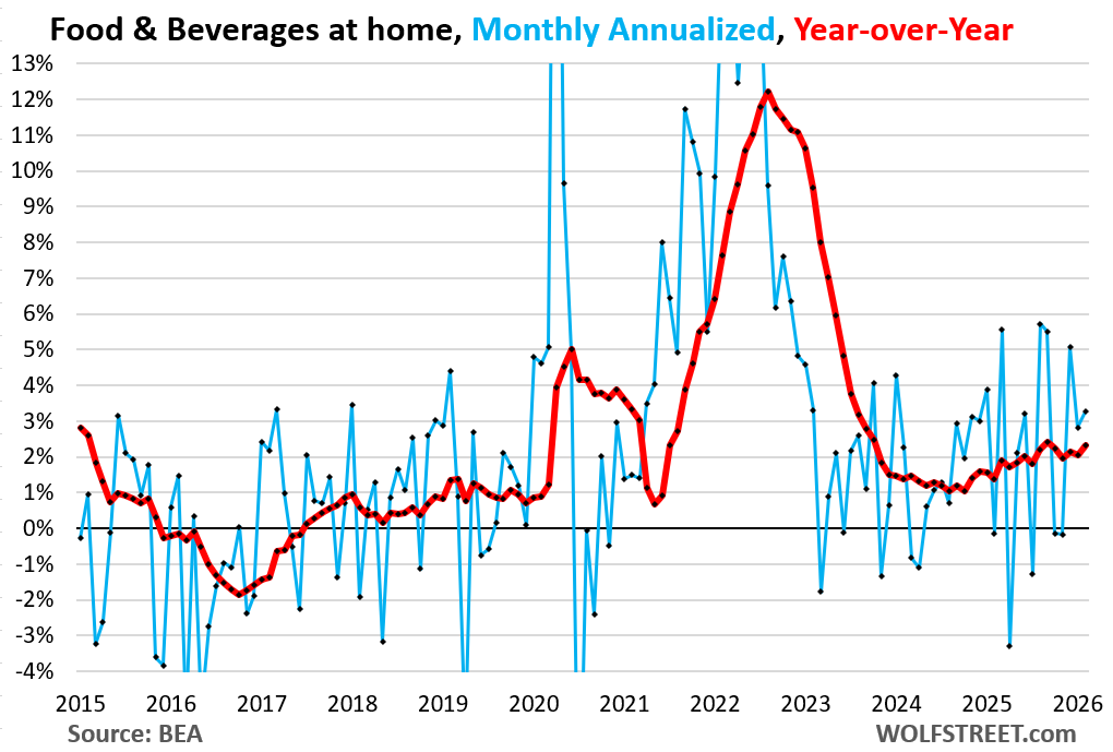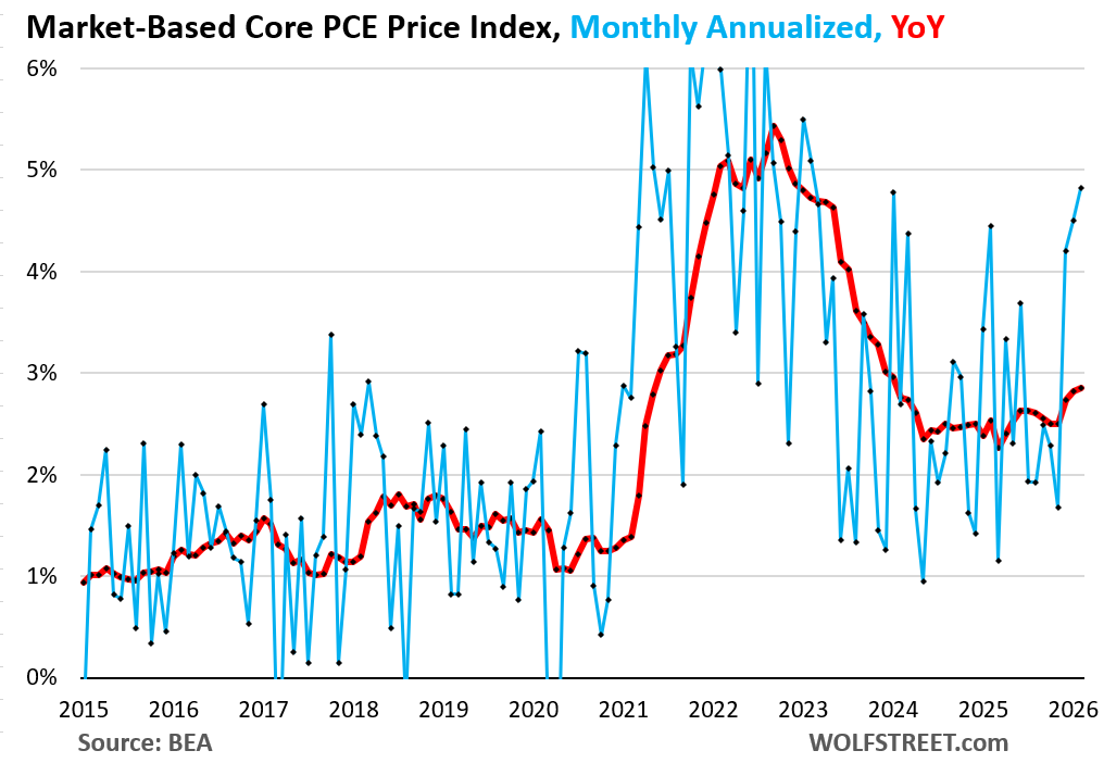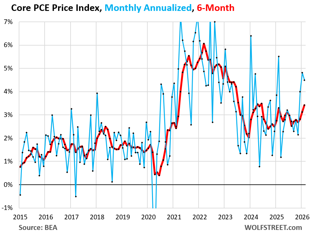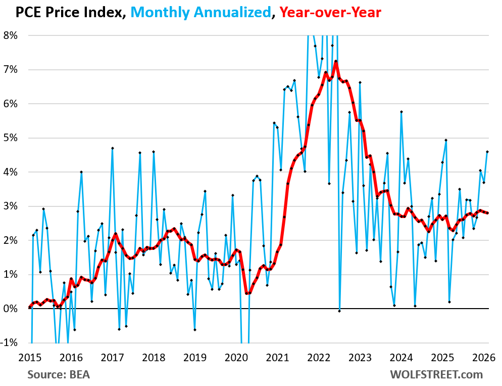The Fed-favored inflation measure, the PCE price index, which includes food and energy, jumped by 0.38% in February from January (+4.6% annualized), the biggest jump in a year, though the energy price spikes from the Iran war hadn’t started yet (blue line).
