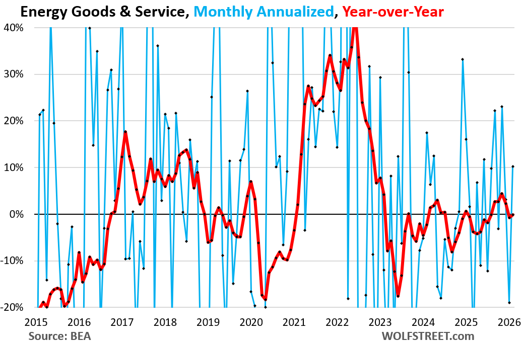 Energy prices jumped in February, before the Iran war, by 0.81% from January (+10.2% annualized), but were still unchanged from a year ago.