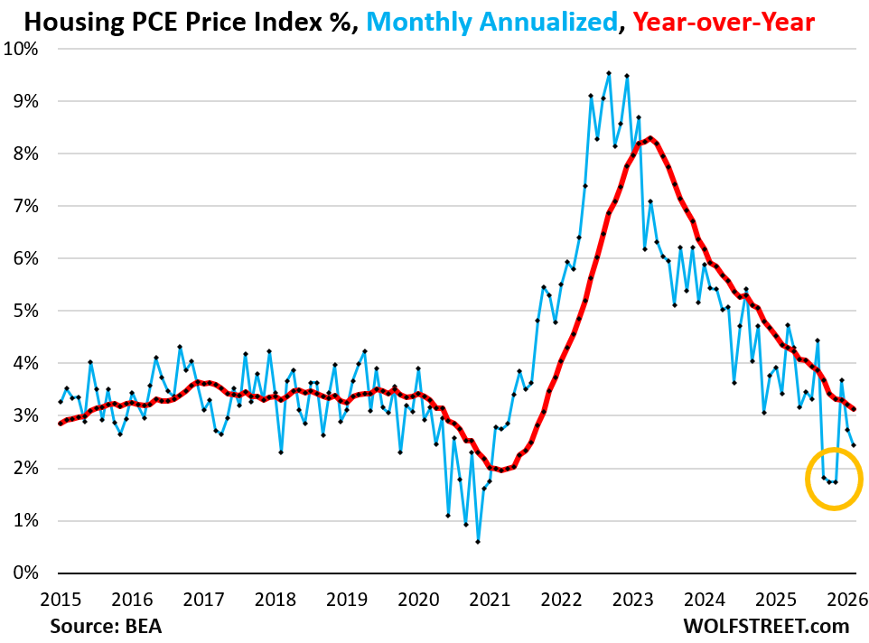 In February, the housing PCE price index rose by only 0.20% (+2.45% annualized, blue in the chart below). Year-over-year, it rose by 3.1% (red).