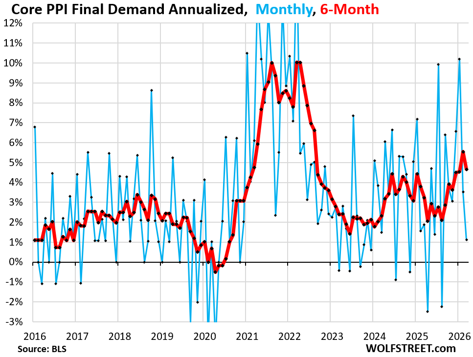 This small month-to-month increase caused the six-month core PPI to back off a notch to +4.7%, the second worst since August 2022, behind only the +5.5% in February.