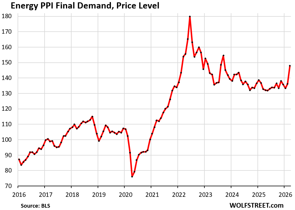 The chart shows the price level of the energy PPI. The big spike in March pushed the price level to the highest since the September 2023 spike.