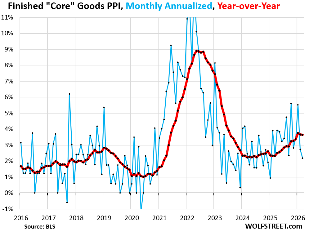 The PPI for food that producers buy held down the overall PPI: It fell on a month-to-month basis by 0.27%, after the gigantic spike in February of 2.39%, and the plunge in January.