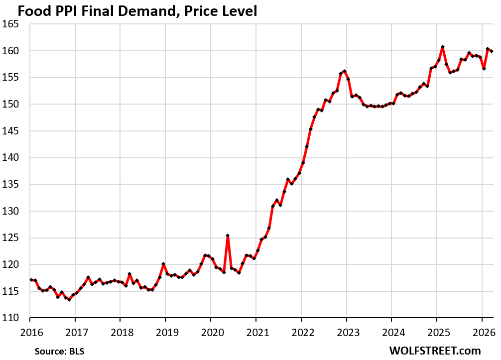 Food prices are also hugely volatile, so it helps to look at the price level. The PPI for food is up by 33% from mid-2020, prices are very high, but they’ve been bumping into a ceiling at these levels, it seems.