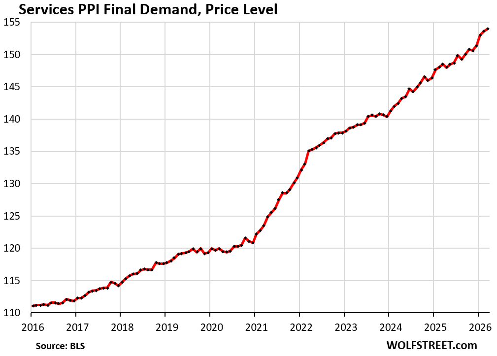Despite the month-to-month squiggles, services prices have been marching relentlessly higher. Since mid-2020, the services PPI has risen by 28%. The chart shows the price level, and its steep trajectory. This is 68% of the overall PPI: