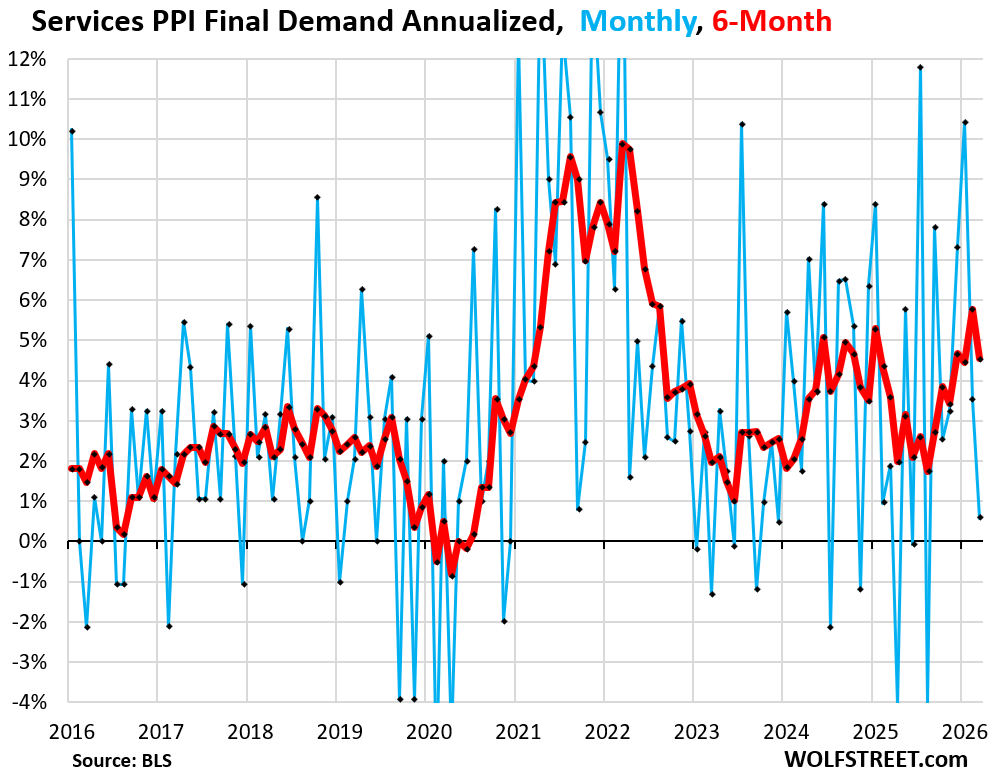 The services PPI barely ticked up 0.05% (+0.6% annualized) in March from February, seasonally adjusted, after the big increases in the prior three months.