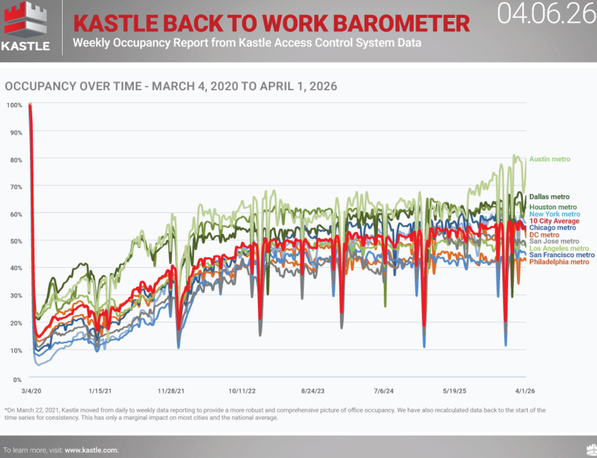 Kastle’s “Back-to-Work Barometer” measures office occupancy by how many people enter an office building for which Kastle provides the electronic access system. It measures office occupancy by people entering these office buildings as a percentage of the baseline before Covid. If office occupancy returns to pre-Covid levels, the barometer would return to “100%.”