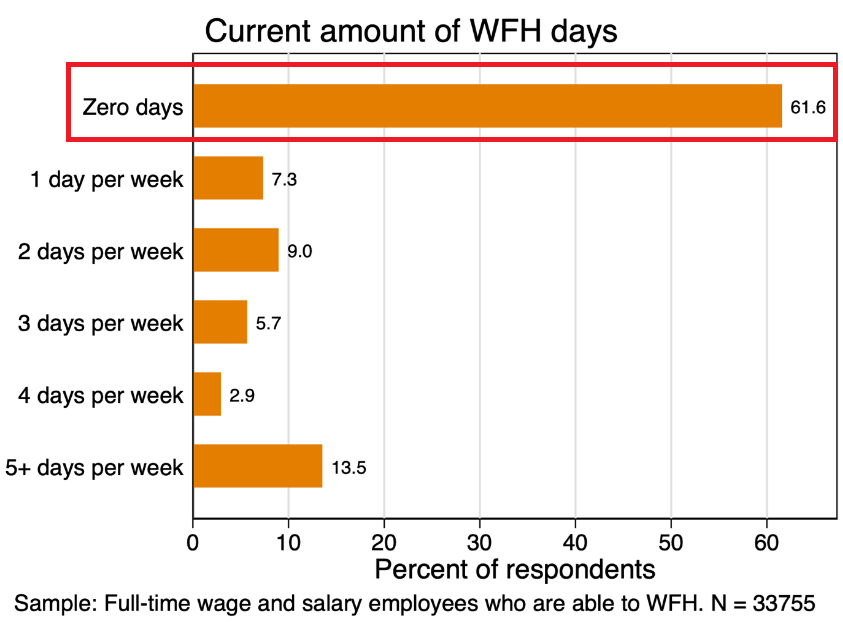 The first chart below shows how many days per week of WFH workers actually have: 61.6% of workers have zero days of WFH, up from 60% last year (brown bars).