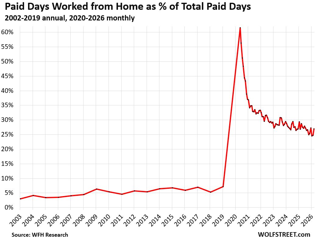 But despite all these efforts, progress over the past three years has been minimal. The share of “full paid days worked from home” as a percent of total days worked rose to 26.9% in March, in the range where it had been in 2024, and just a couple of percentage points below March 2023, according to data by Jose Maria Barrero, Nicholas Bloom, Shelby Buckman, and Steven J. Davis, published by WFH Research. A full day is defined as working 6 or more hours that day.