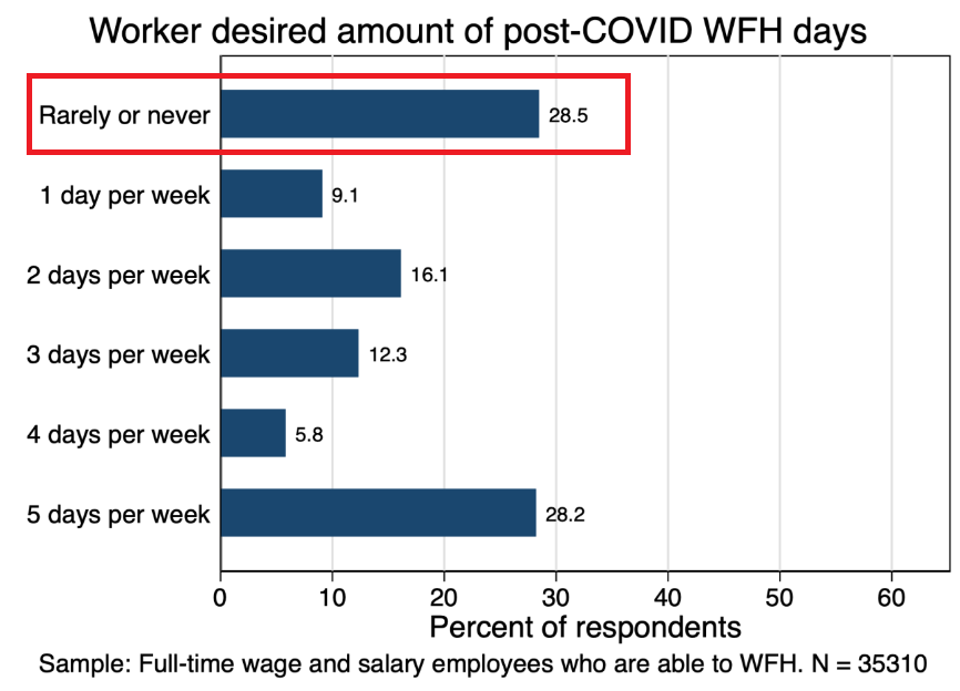 The second chart shows how many days a week workers want to WFH: only 28.5% of workers want to have zero days of WFH (blue bars). Charts via WFH Research.