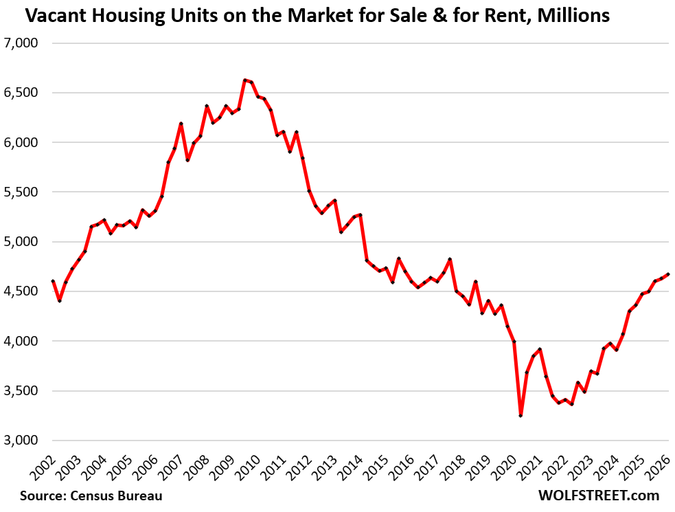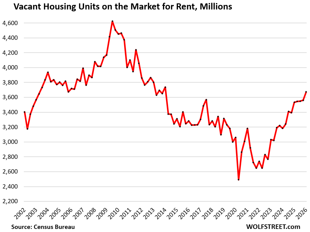 Vacant housing units on the market for rent – including by “accidental landlords” – rose by 6.1% year-over-year to 3.67 million in Q1, not seasonally adjusted, the most since 2014.